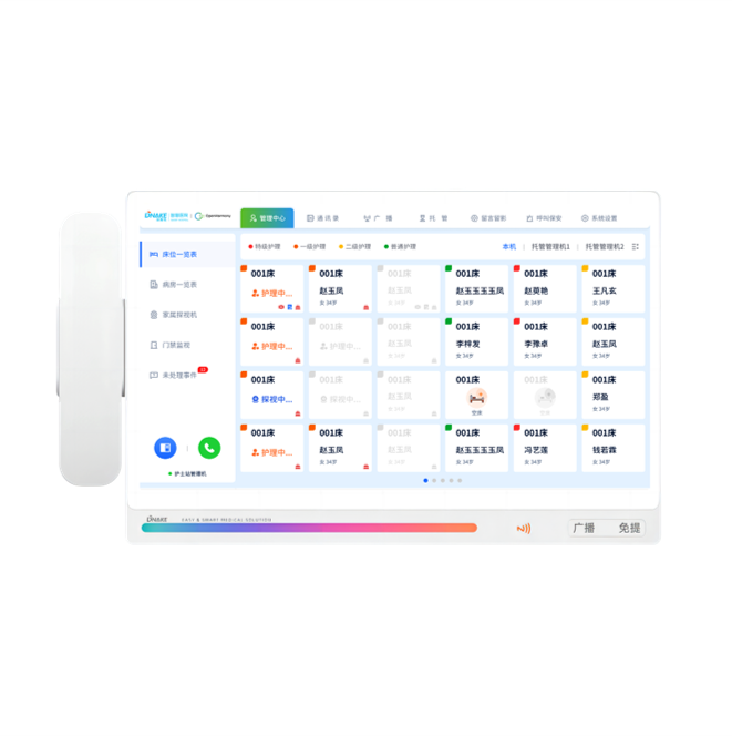 創(chuàng)新設(shè)置在護(hù)士站,可壁掛也可直接放在桌面上。主要接聽病區(qū)內(nèi)病床分機(jī)的呼叫以及患者信息查詢、廣播等基礎(chǔ)應(yīng)用功能,減輕醫(yī)護(hù)人員來(lái)回跑動(dòng)的無(wú)效勞動(dòng)和壓力,及時(shí)響應(yīng)患者需求,并做好醫(yī)護(hù)信息管理。軟件參數(shù):1)采用多點(diǎn)觸控電容顯示屏操作。每個(gè)觸摸按鈕可以顯示整個(gè)病區(qū)下的,所有病人的名字、性別、護(hù)理等級(jí),點(diǎn)擊格子后,可顯示每張病床患者更具體的患者信息。2)基于TCP/IP網(wǎng)