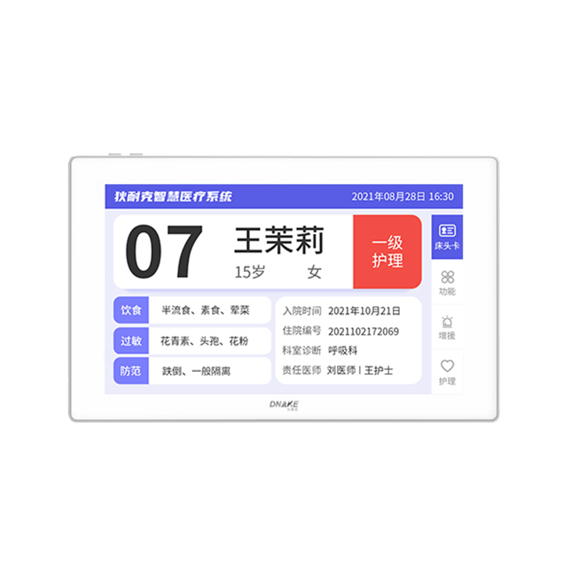 安裝在病床頭的交互設(shè)備機,代替?zhèn)鹘y(tǒng)紙質(zhì)卡。產(chǎn)品支持呼叫對講、為住院患者提供病例查詢、狀態(tài)自動提醒等護理需求等。